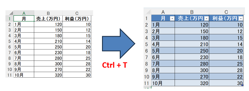 データを選択して Ctrl+T でテーブル化すると、見た目が整うだけでなく、並べ替えやフィルターもワンクリックで可能になります。