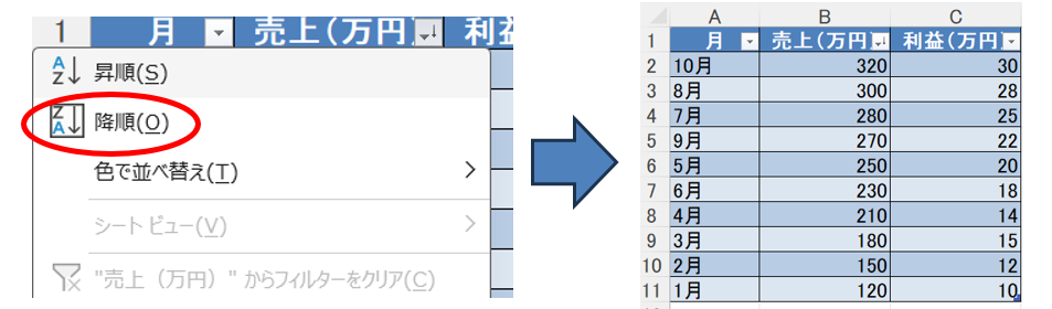 売上データを「売上高が高い順」に並べたり、「特定の商品だけ表示」することで、簡単に傾向を把握できます。