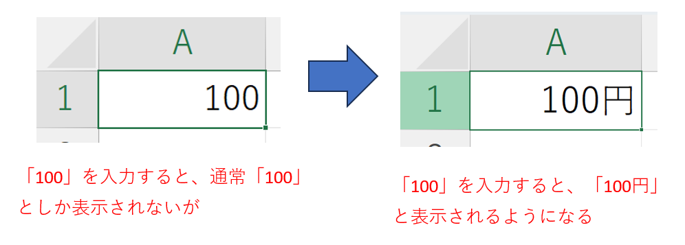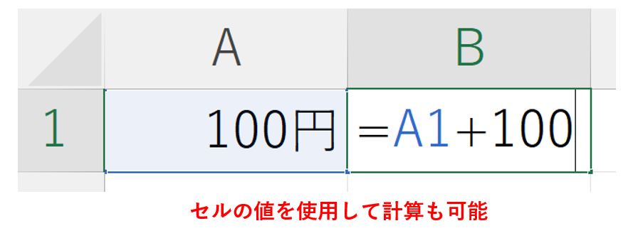 ユーザー定義のよい所は、「100円」と入力してしまうと文字扱いになってしまうので計算ができませんが、ユーザー定義で表示している「100円」の値はあくまで「100」なので、計算に使えるということです。